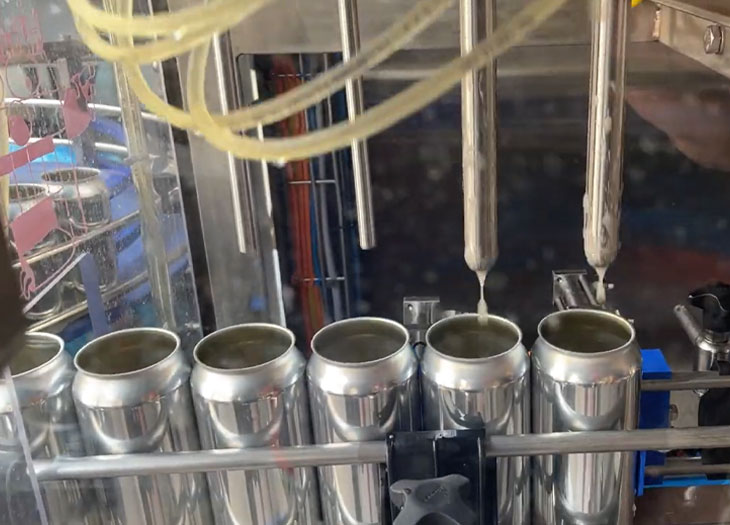 Filling is fully adjustable by time; optimised by the inbuilt brite tank pressure monitor for extremely consistent filling levels. A central conveyor system with can guides provides smooth transfer of cans, minimising sloshing and dissolved oxygen pick up. The height adjustable lid dispenser feeds into the seaming head and mechanical cam driven seaming ensures the highest seam integrity. Seaming rolls have sealed for life bearings and run on the vacuum hardened cam profiles. After the seaming station, the cans are rinsed and dried. The Siemens control system and touch screen gives the operator full flexibility over the canning line. A temperature and pressure sensor feed live information to the touch screen display, for monitoring the condition of the incoming beverage product.